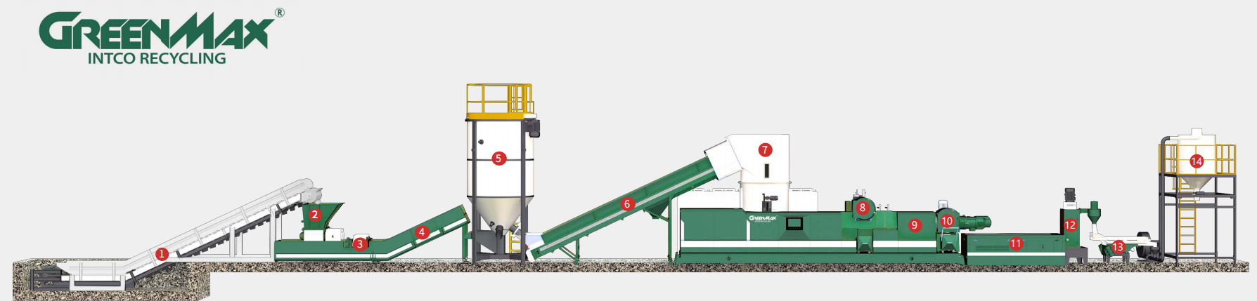 INTCO RECYCLING, beneficiando di vent’anni di ricca esperienza nel campo della granulazione e del riciclaggio del plastico, presenta con grande impegno la serie di linee di granulazione del plastico GREENMAX. Dotata del concetto cardine "Green the World, Max the Value" (Verde al Mondo, Valore Massimizzato), questa attrezzatura, attraverso un design su misura e l’integrazione di tecnologie all’avanguardia, offre soluzioni efficienti, stabili e rispettose dell’ambiente per ogni tipo di esigenza di trattamento e riciclaggio del plastico, aiutando le aziende a raggiungere gli obiettivi di sviluppo sostenibile.
